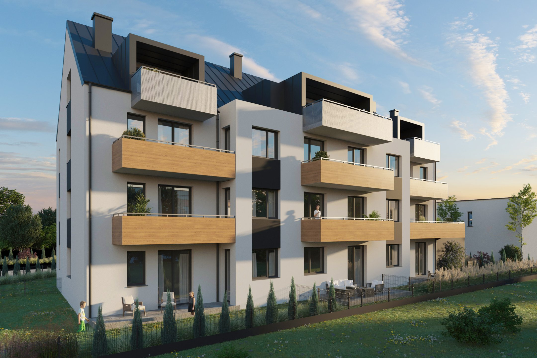 Mieszkania na parterze posiadają duże ogródki, mieszkania na piętrze mają balkony a dwa z nich także duże tarasy. Na drugim piętrze znajdują się lokale mieszkalne z antresolami i przestronnymi loggiami.